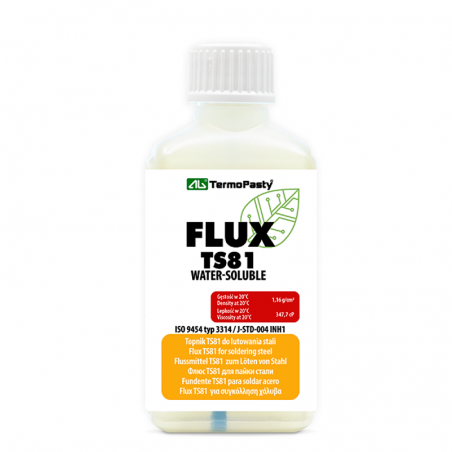 Topnik TS81 to bezkalafoniowy, wysoko aktywny topnik, stanowiący mieszaninę związków nieorganicznych i organicznych. Preparat zaprojektowany do lutowania stali, w tym kwasoodpornej, oraz stopów chromowo-niklowych. Dzięki swojej zaawansowanej formule (ISO 9454 typ 3314 / J-STD-004 INH1) zapewnia trwałe, precyzyjne i estetyczne połączenia lutownicze, niezależnie od stopnia trudności materiału. Produkt Water-soluble, łatwy do usunięcia po procesie lutowania.