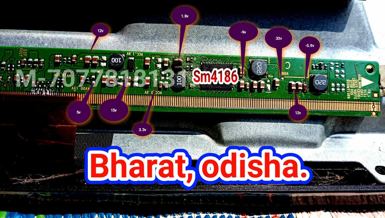 The SM4186 IC for power management and signal processing in Samsung LCD TV panels. The chip has several voltage regulator circuits: the VGH charge circuit as a voltage boost converter and the VGL charge circuit as a voltage drop converter. The AVDD, HVAVDD and VCOM circuits are integrated into the SM4186 IC.